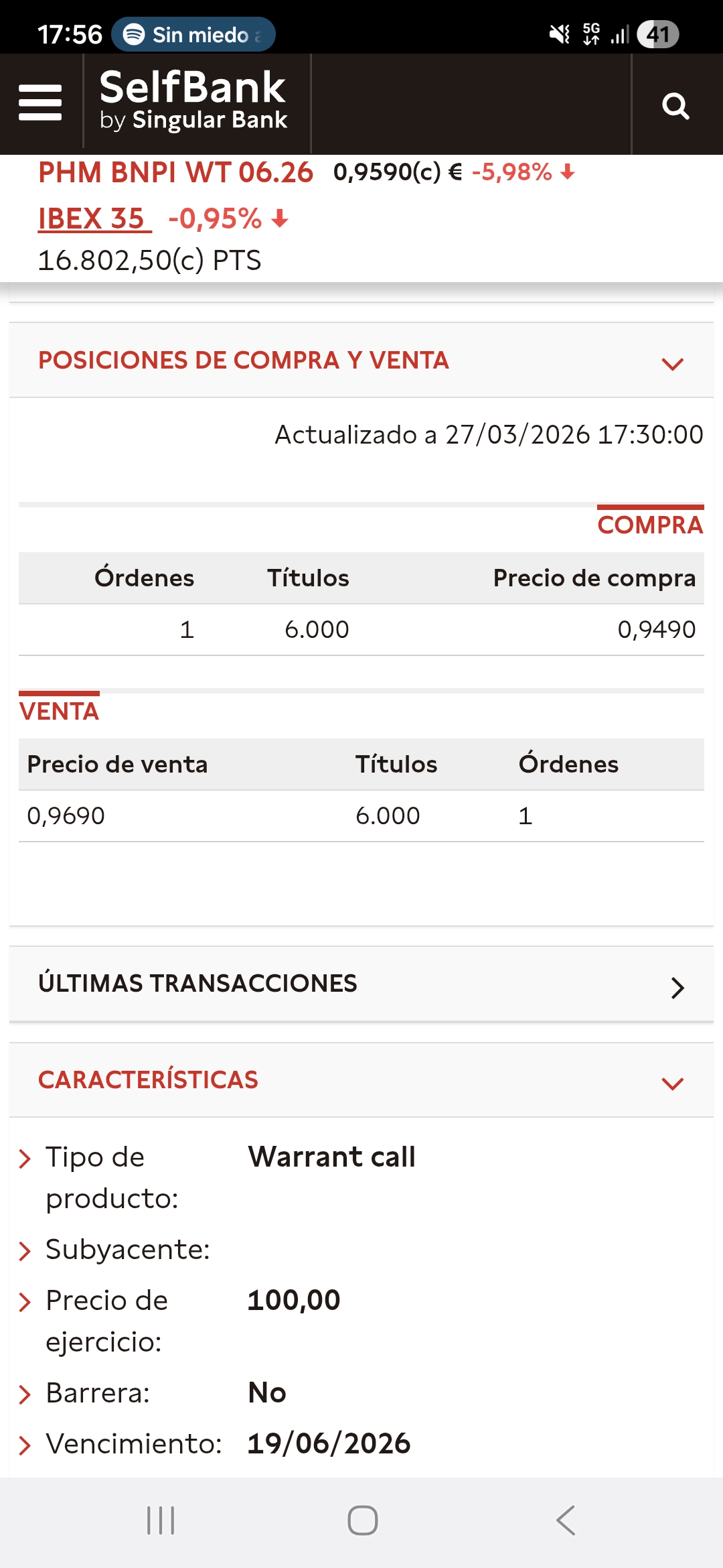 ?Warrant Call 100 (Nuevo): Cae de 1,02 € a 0,959 € (-5,98%).