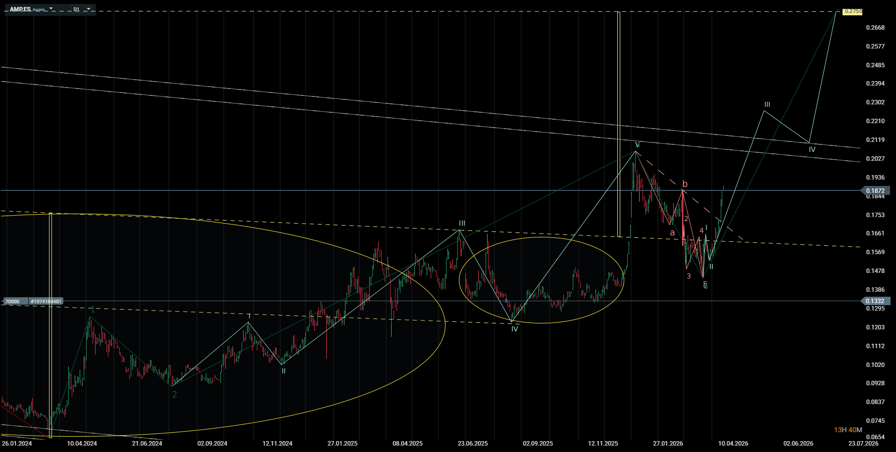 Si la primera raya vertical roja es una onda 1, la siguiente 3 tras esa 2 bajista no la va a igualar, la va a superar con creces.