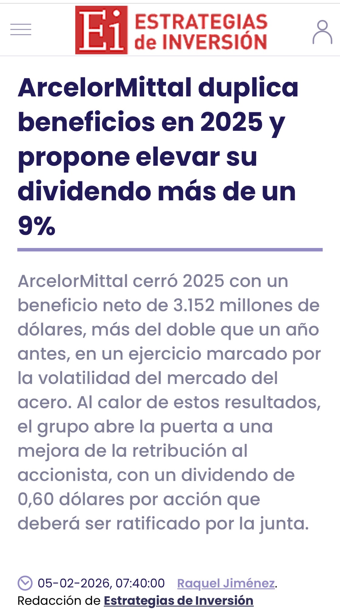 Buenos días, ArcelorMittal ha publicado resultados Q4 2025, muy buenos parece, ojalá sea premonitorio de mejora en los nuestros y nos contagie en el precio de cotización