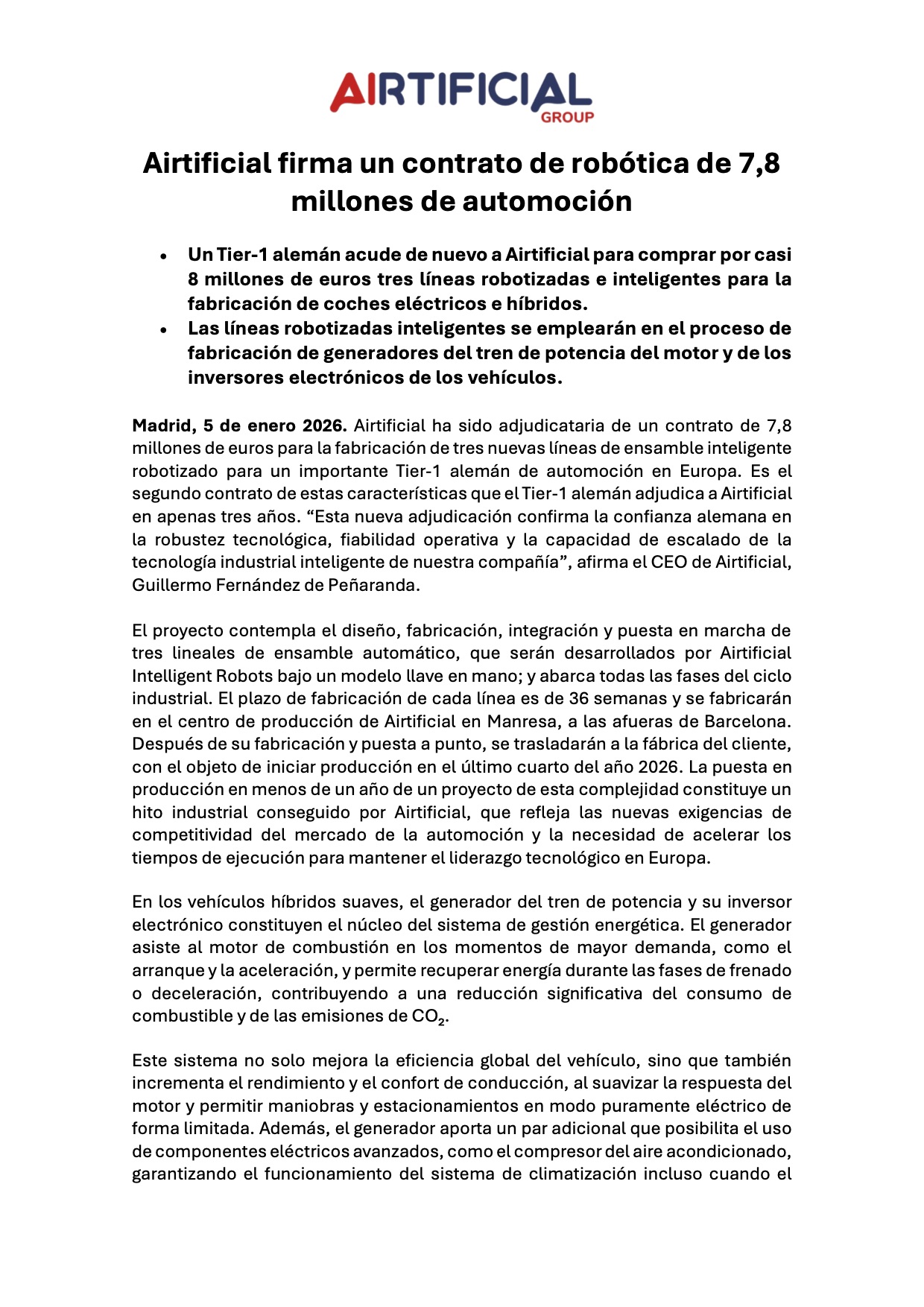 Airtificial firma un contrato de robótica de 7,8 millones de automoción